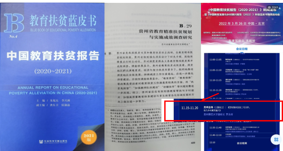 2022年,成果完成人代表中国教育扶贫蓝皮书:《国家教育发展报告(2020-2021)》(贵州卷)编写组交流编写经验,利用新闻发布平台介绍本成果。